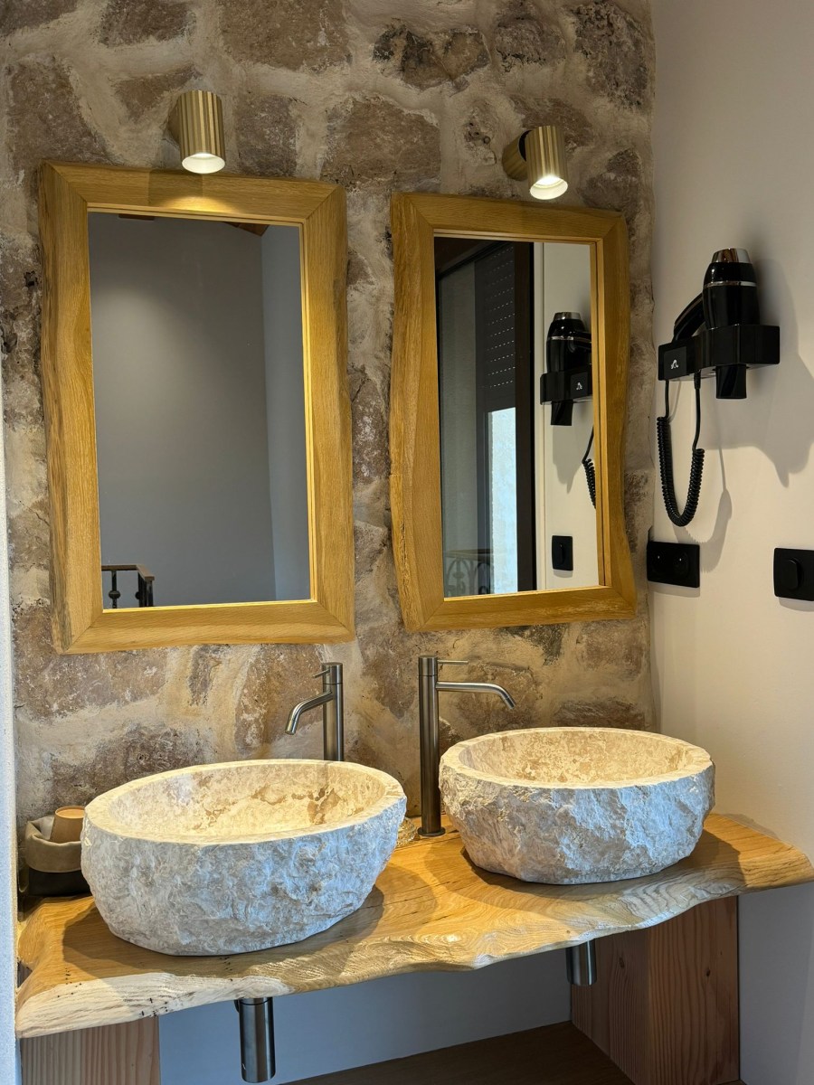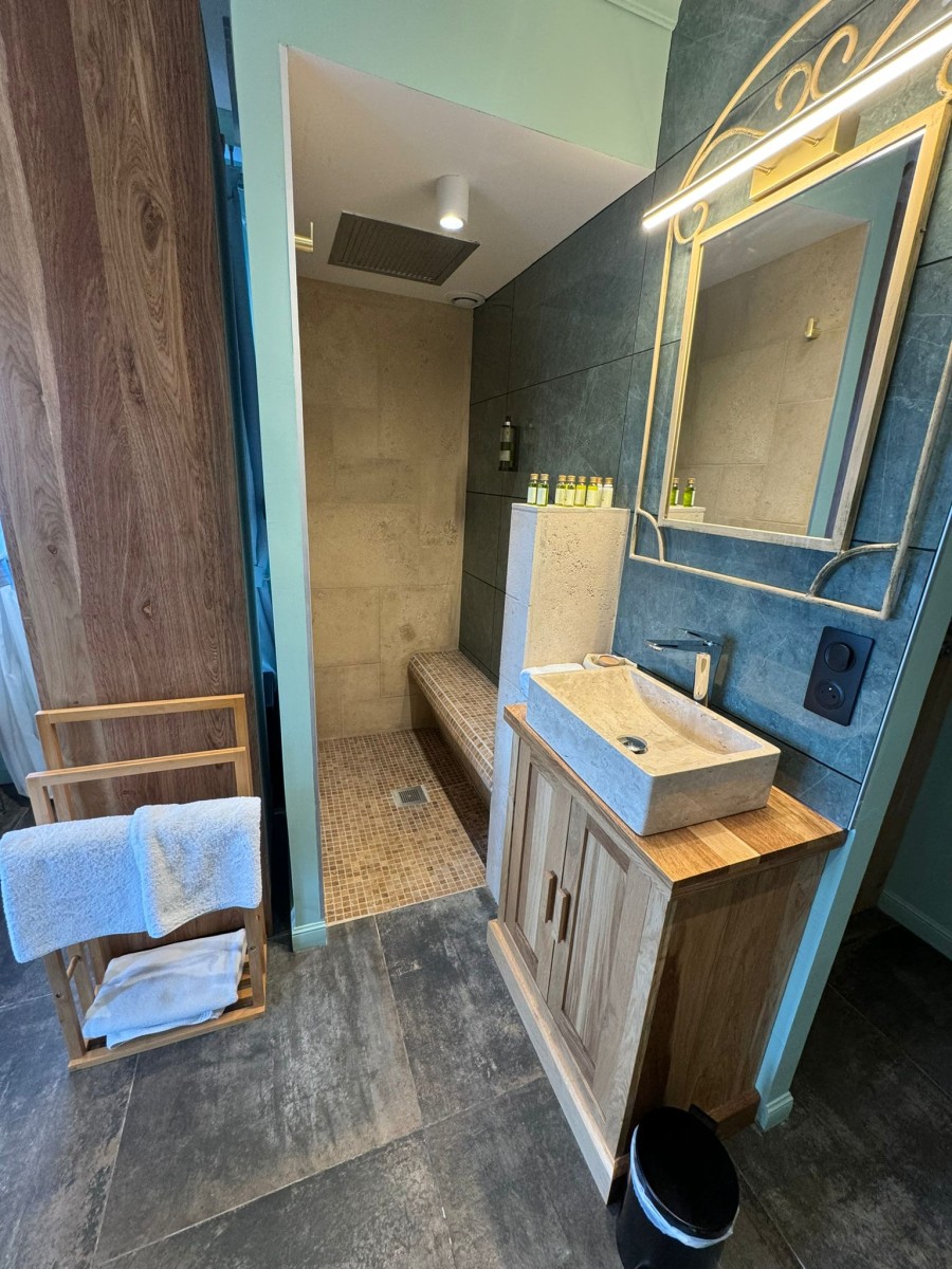 En catégorie standard d’environ 25 m², notre chambre double style bergerie avec baignoire balnéo va vous garantir des nuits reposantes. Elle transmet une atmosphère de la Côte d’Azur. Elle est équipée d’un lit Queen Size, d’une climatisation réversible, d’une TV, d’un coffre-fort, d’un sèche serviette, d’un sèche cheveux, d’un minibar, d’une bouilloire, de toilettes japonaises, de deux vasques en pierre, d’une table d’extérieur et d’un parasol.